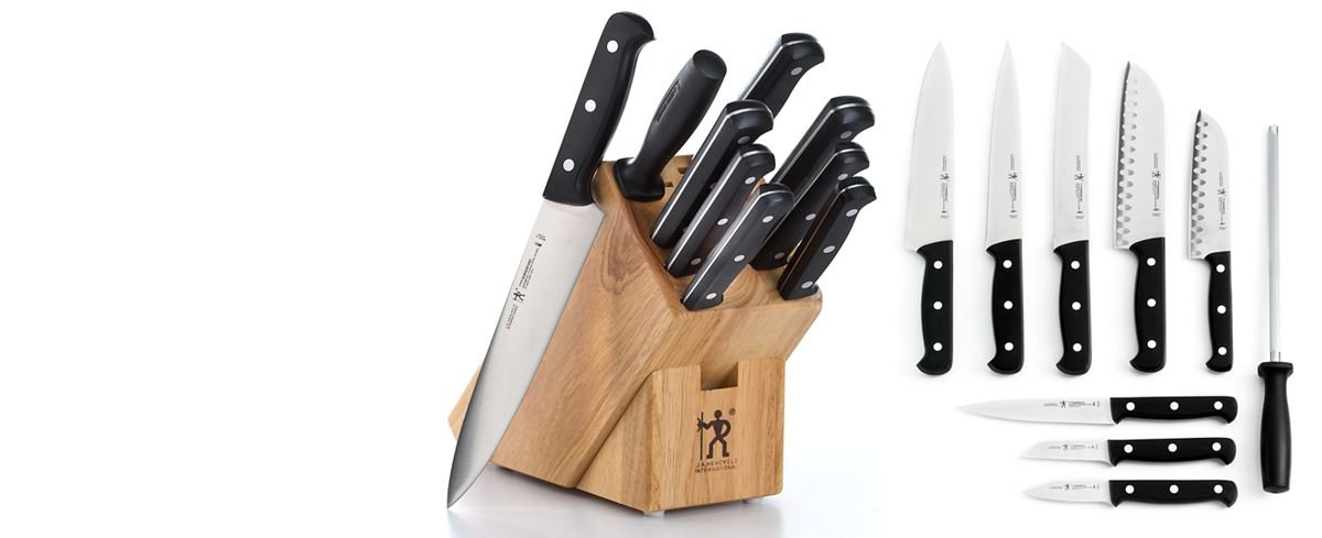 J.A. Henckels Kitchen Cutlery Knife Set With Block Bundle With Zwilling J.A. Henckels Twinshear Kitchen Shears/Scissors is best for youPrecision crafted. Stainless Steel, non-staining, non-rusting. Molded finger grip; easy to hold. Polypropylene handle. Dishwasher safe, easy care, hygenic. 8-inch shears cut food, flowers, paper, cardboard, even carpet.Steel-tooth inset in handle opens bottle and other screw caps. 10-piece knife set includes: 3' paring knife, 3' vegetable knife, 5' utility knife, 5' santoku knife, 7' hollow-edge santoku knife, 8' hollow-edge chef's knife, 8' bread knife, 8' carving knife, 9' sharpening steel and Hardwood knife block. Hardwood block includes extra slots to incorporate your own pieces. Made in Germany.