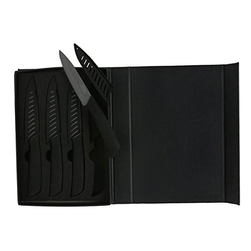 Metallic Red Handle and Black Blade Ceramic Steak Knife and Cover 8-piece set is best for youLet them eat steak when you arm them with this steak knife set. These handsome knives feature super-sharp ceramic blades that quickly cut through the toughest meats while the ergonomically designed ABS Handles offer a comfortable grip. Knives do not rust or leak metal ions from exposure to moisture, oils and acids in common foods.