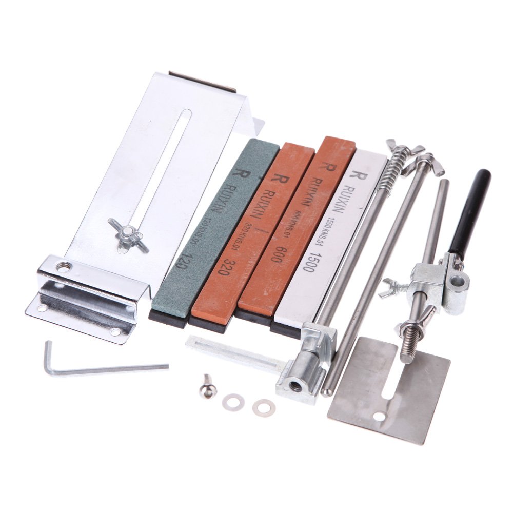 • The 8milelake Upgraded Fixed-angle Knife Sharpener Kit Full Metal Professional 4 Sharpening Stones is a