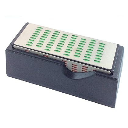 Are you afraid of cutting yourself when honing your knife? Relax, you don't have to be! We've designed this knife sharpener to be as safe as can be. It comes with an ergonomic handle that gives you superior grip, and keeps your hand away from the blade thanks to its length. The base is also rubberized to provide maximum stability. No more dealing with risky sharpening stones!the Knife Sharpener Sharpening Stone Kitchen 4 Sided Diamond Hone System Sharpen Steel Whetstone New designed with a unique feature called “edge grip. ” What does this mean? Well the bottom of the sharpener has been designed to allow the sharpener to rest on the edge the counter top or table. Why is this helpful? Sometimes when you sharpen a large chef’s knife with a smaller sharpener, you might drag the tip of the knife across the counter top. This can damage the knife or worse the countertop. So sharpening on the edge with the edge grip allows the knife to pull through the slots from heel to tip. Of course you can still use the Edge Grip on top of the surface but isn’t it nice to have flexibility when sharpening if you need it? The bottom is made of a non-slip material that allows for safe and sturdy sharpening. Knife Sharpener Sharpening Stone Kitchen 4 Sided Diamond Hone System Sharpen Steel Whetstone New is best for youThe ultimate knife sharpener. This diamond hone knife block sharpening stone makes tool, blade, and knife sharpening almost effortless. The 4-sided diamond hone block has a different grit on each face, ranging from extra coarse (200 grit) to fine (600 grit). Each of the 4 sides of the hone sharpener has three layers of diamonds that are nickel bonded to the steel frame. The hone block fits into a hard plastic case with rubber pads on the bottom that prevents slippage during sharpening. Oil is not required for this sharpening hone block. Water in a spray bottle is all you need to make your sharpening smooth, clean, and effortless.